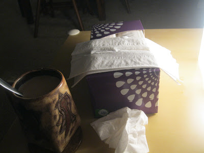 Only the remote of the TV is missing in this picture! Thank God for a hubby who made me coffee so I would feel better... he's the best!
