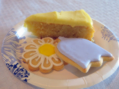 This month... the "winner cake" was an "Almond Streamliner Cake with Lemon Custard" from the Vintage Cakes Book by Julie Richardson, it is such a great book and all the recipes have worked for me so far! I didn't vote for this cake because hubby doesn't really love "lemony desserts" so I was actually a little "bummed" when this cake was chosen... I think the same thing happened last month... LOL! But we're a team so I still joined the group and baked it... I usually try to share my cake with friends... I just invite everyone who wants some cake to come to my house for cake and coffee (an open house kind of thing) and they come, children and everything for some good conversation and a sweet treat! I hadn't done this since last year because of Holidays... but once Easter was done I knew it was time to re-start my tradition.... And like usual I had a great turn out!